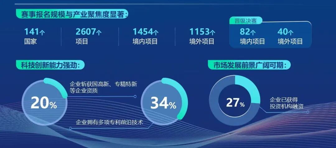 自5月21日启动后,共吸引来自全球141个国家的2607个项目报名,其中包括境内项目1454个,境外项目1153个。经专家评审与加速营赋能,最终82个境内项目、40个境外项目晋级决赛。项目覆盖人工智能、数字医疗等前沿赛道,深度契合区域产业发展规划,实现了创新资源与地方产业需求的精准对接。