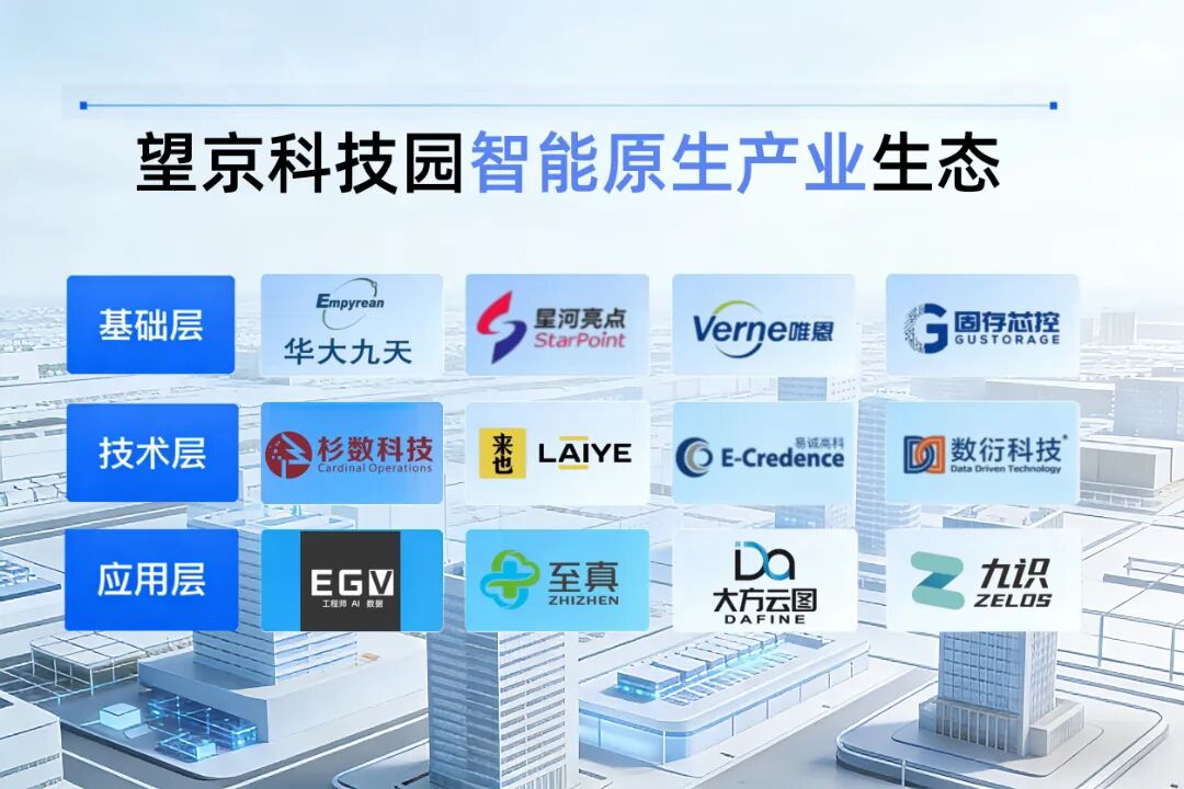 自“十四五”规划实施以来,望京科技园便将人工智能产业作为核心布局方向,如今已集聚起一批优质智能原生企业,形成了基础层-技术层-应用层全链条布局的产业生态,让智能原生的创新活力充分迸发。在基础层,算力基础设施、数据中心、传感器芯片、边缘计算设备等企业扎堆集聚,为智能原生发展筑牢技术底座,让算力、数据等核心要素实现高效供给,集聚了华大九天、星河亮点、唯恩传感、固存芯控等优质企业;在技术层,机器学习、自然语言处理、计算机视觉、智能决策、多模态AI等核心算法企业齐聚,不断突破技术瓶颈,为各领域智能升级提供核心支撑,集聚了杉数科技、来也科技、易诚高科、数衍科技等技术创新企业;在应用层,智能原生技术深度融入智慧城市、智能制造、智慧医疗、智能金融、智能教育、智能交通、智慧能源等多元场景,从实验室走向产业一线,实现商业化规模化应用,让智能技术真正赋能实体经济,集聚了大方云图、九识智能、易智唯思、至真明达等应用企业。