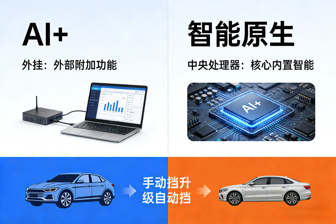 简单来说,“AI+”是给传统产业、现有模式加一个AI“外挂”,比如用AI做文案、做数据分析,核心流程仍按原有逻辑运行;而智能原生,是从底层架构、产品设计到组织模式、商业逻辑,全维度围绕人工智能重构,让AI不再是辅助工具,而是像“中央处理器”一样,成为产业发展的基础支撑和核心引擎。就像从“手动挡”到“自动挡”的跨越,不是简单的功能叠加,而是对发展模式的全新定义。