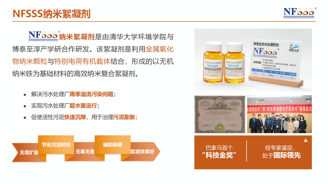 本次获奖项目提出了一套不新建、不停产、低成本、高效率的“原位扩能”技术路径,核心在于创新性地应用了NFSSS纳米絮凝剂。